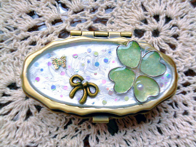 パール調の台に淡い色合いの四つ葉を組み合わせたピルケースです。