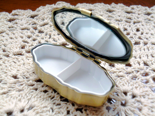 中身は仕切りで二つに分かれていて、蓋の内側には鏡が付属しています。