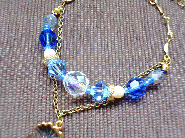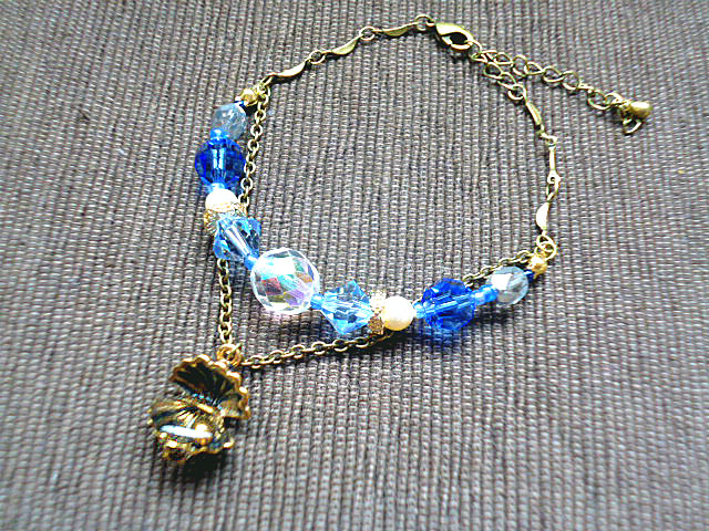 青系のガラスビーズと、真珠モチーフの入ったオープンシェルチャームを使用したブレスレットです。