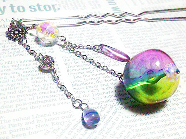 先日載せた単色のガラスも透明感があって綺麗なのですが、ファイアオパールを使用したこちらは色合いも華やかで、作っていても楽しくてついガラスやパールをたくさん乗せてしまいました…笑