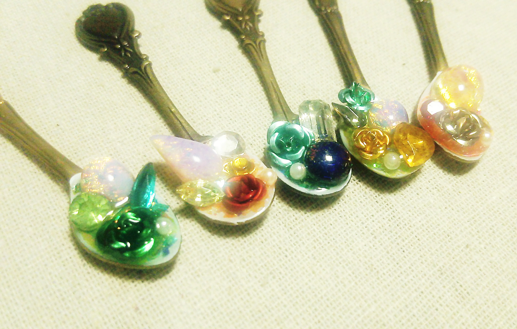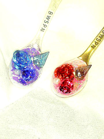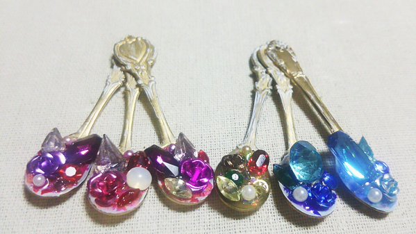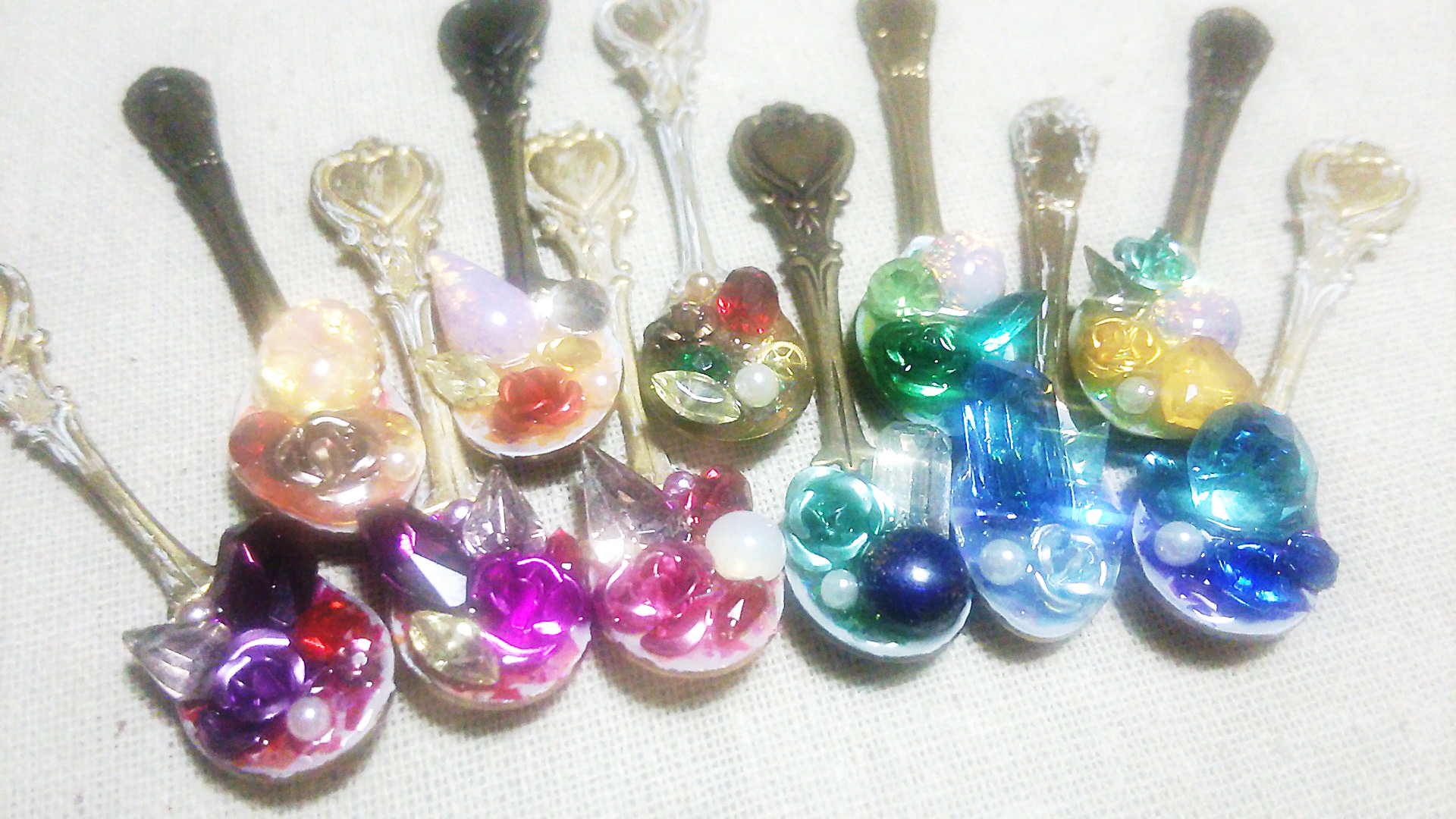 スプーンの色や形も違ったり、使用しているヴィンテージガラスの組み合わせも違ったり、同じものはない一点ものですので、ぜひお気に入りのスプーンを見つけに来てくださいね!