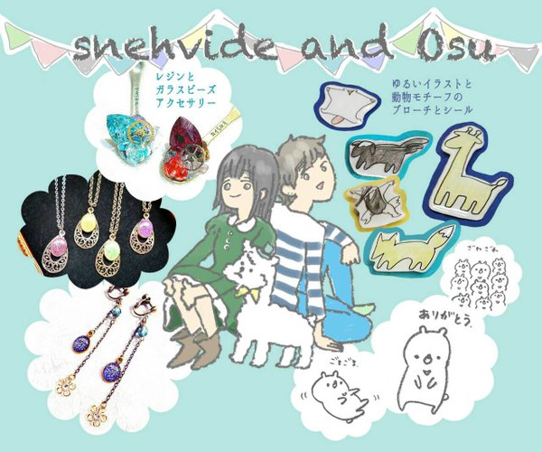私はレジンとヴィンテージガラスを使ったアクセサリー(今回はスプーン多めです)、Osuさんは動物モチーフのシールやブローチなどを用意してお待ちしております!
