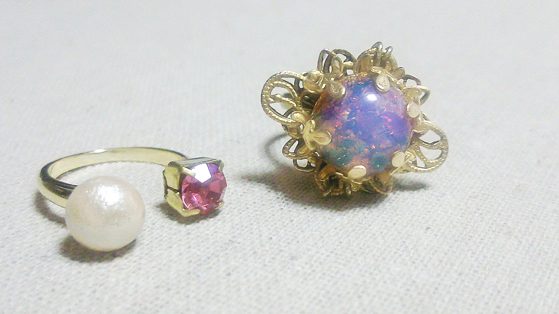 右:ファイアオパールガラスのリング